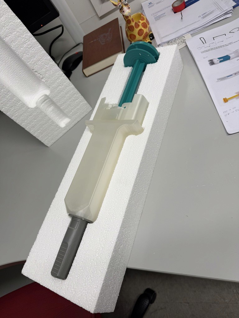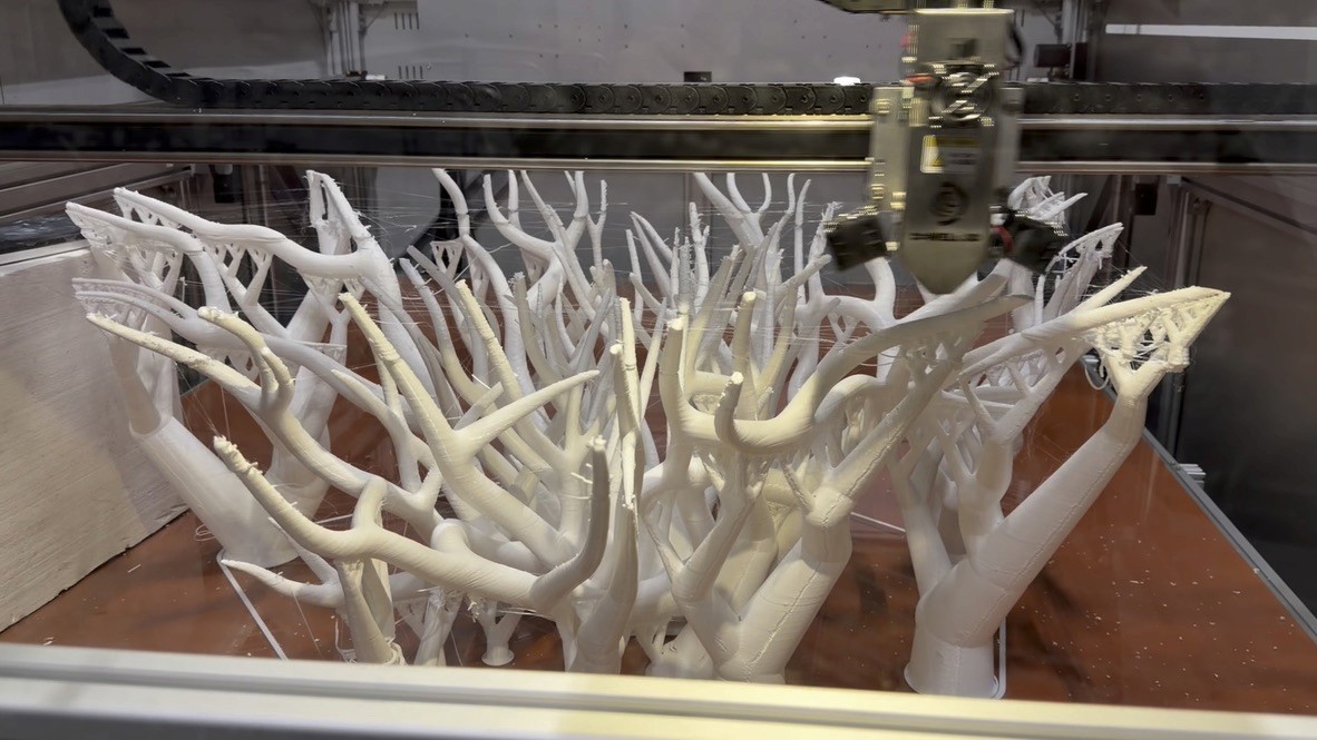 The installation is complemented by custom-designed syringe elements, transforming functional medical objects into sculptural design pieces. This contrast between organic forms and clinical shapes creates a powerful conceptual balance.