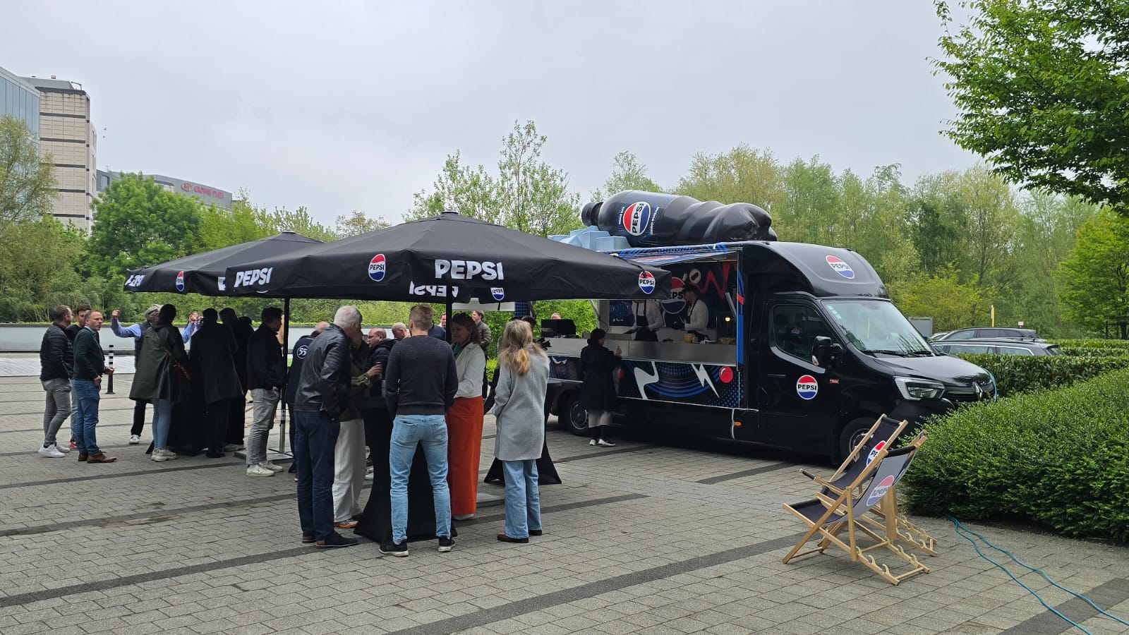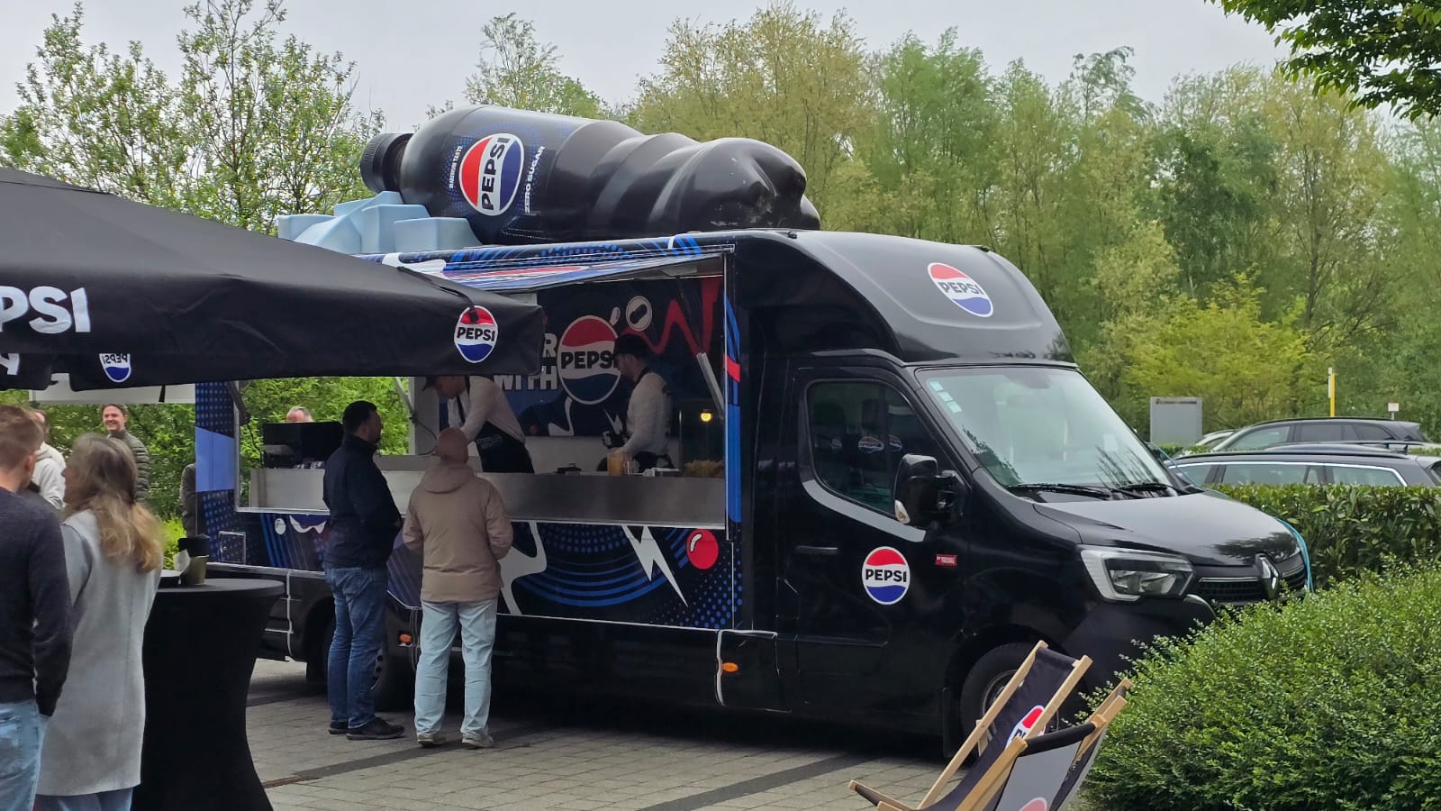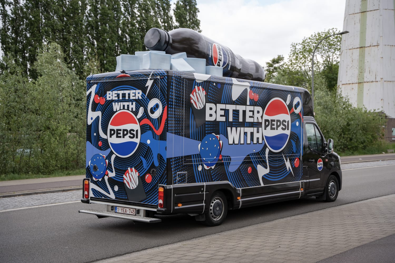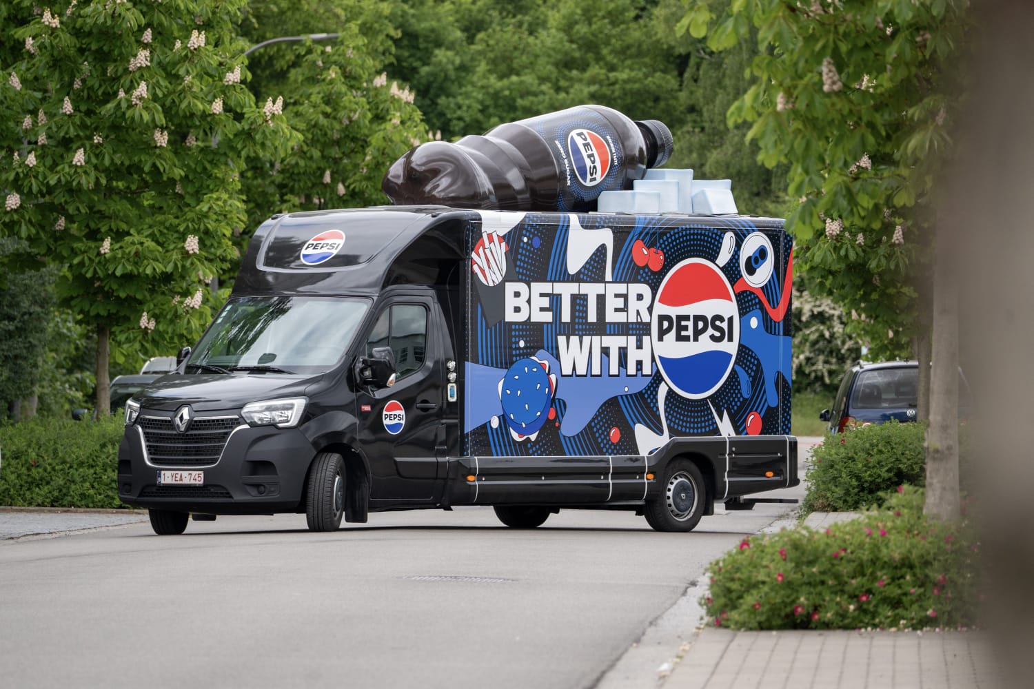 The project features a fully branded delivery truck wrapped in the iconic Pepsi visual identity, enhanced by a large-scale 3D Pepsi bottle mounted on the roof. This oversized element serves as a striking visual landmark, instantly recognizable from a distance and highly effective for both street visibility and social media engagement.
