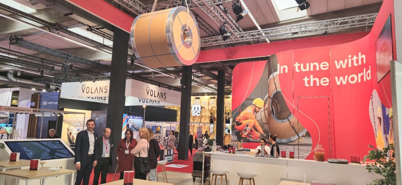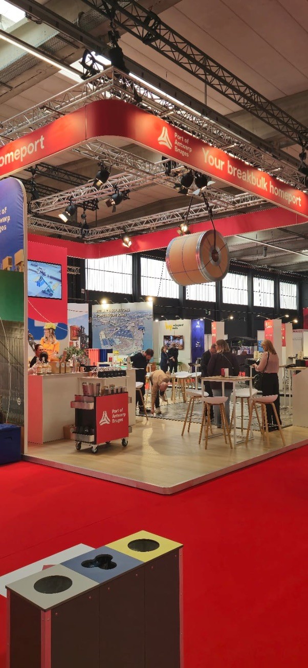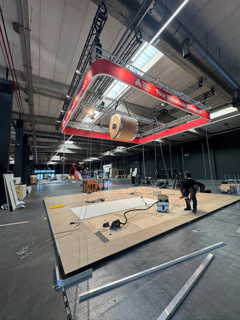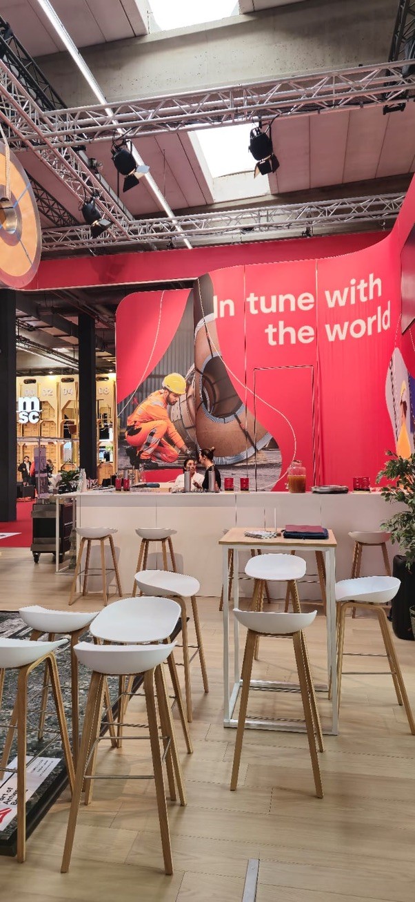 This element became a strong visual focal point of the stand, emphasizing the industrial identity of the brand and attracting attention from a distance.